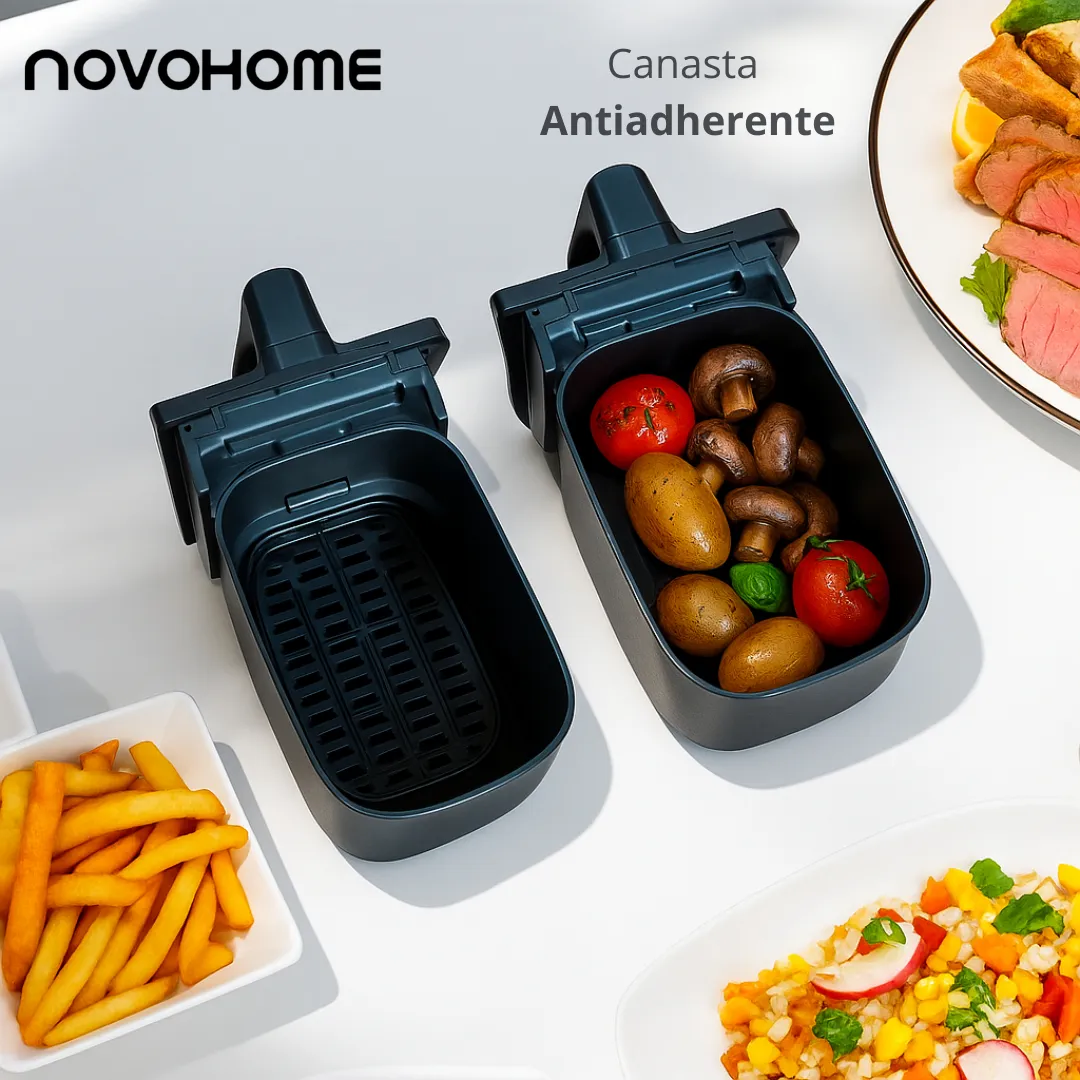 La freidora de aire Novohome NH-AF DUAL 220V es una solución versátil y moderna para preparar comidas saludables y sabrosas en menos tiempo. Con doble canasta y tecnología avanzada de circulación de aire caliente, permite cocinar diferentes alimentos al mismo tiempo, optimizando el tiempo en la cocina. Su diseño elegante y funcional facilita el manejo, con un panel de control intuitivo para ajustar tiempo y temperatura en cada canasta de forma independiente. Ideal para quienes buscan practicidad y un sabor increíble en cada plato, con un consumo mínimo de aceite.